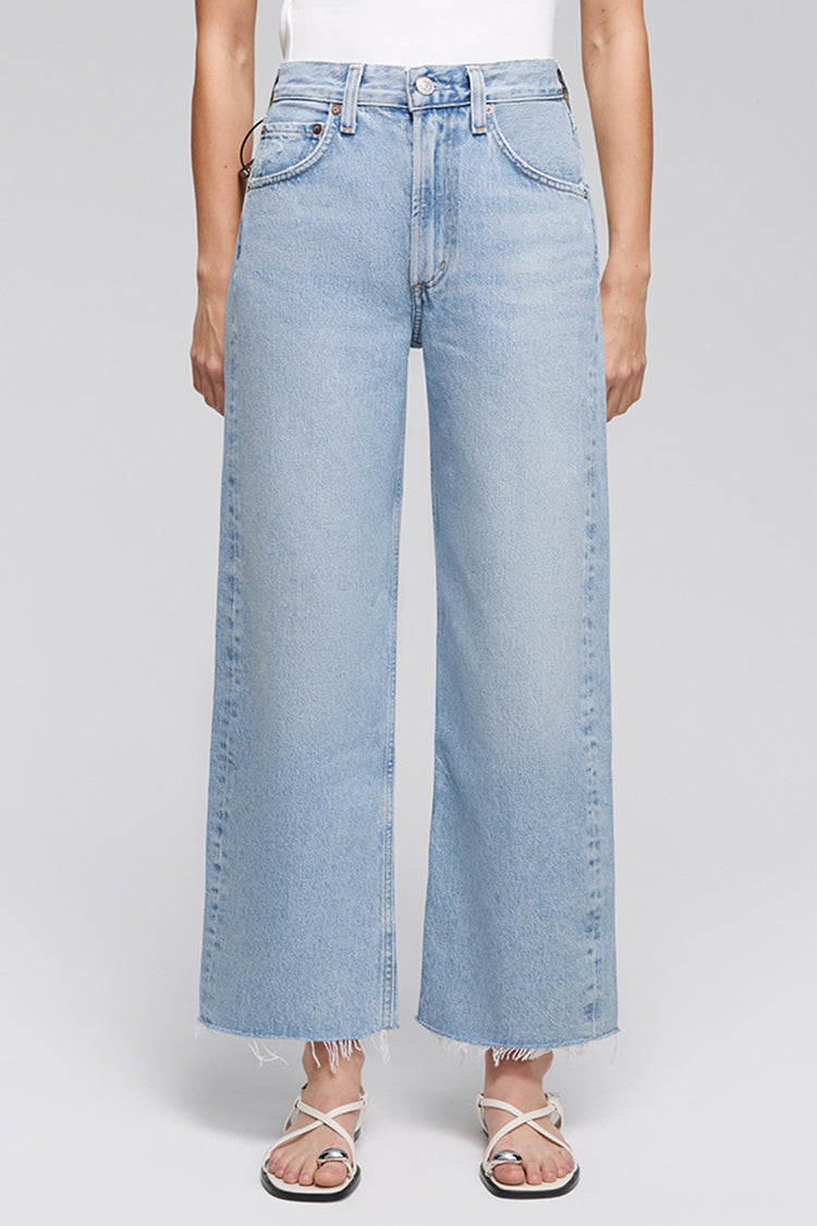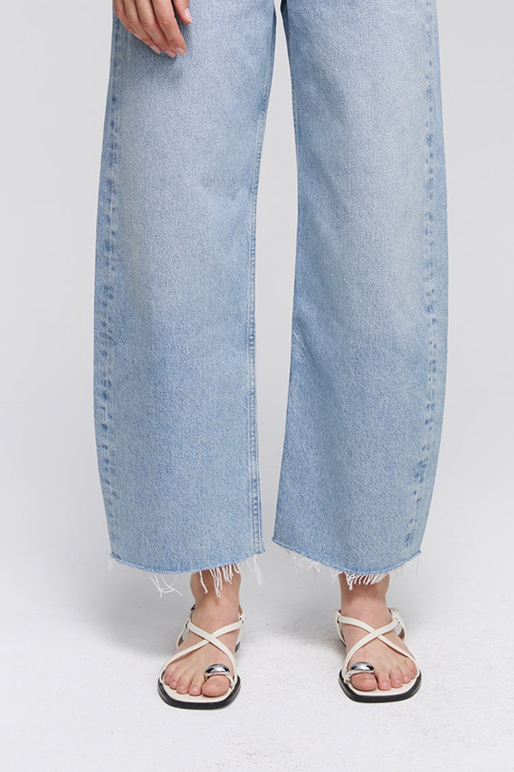 he Low Curve Fray is a summer-ready adaptation of the classic Low Curve Jean. Featuring a cropped inseam, this version is tailored for warmer weather, with a frayed hem that adds a laid-back, effortlessly chic touch. Crafted from regenerative cotton, the vintage marbled light indigo denim features fading, whiskering, and a frayed hem for a perfectly worn-in look. Pair with a relaxed tank and sandals for a casual summer vibe.