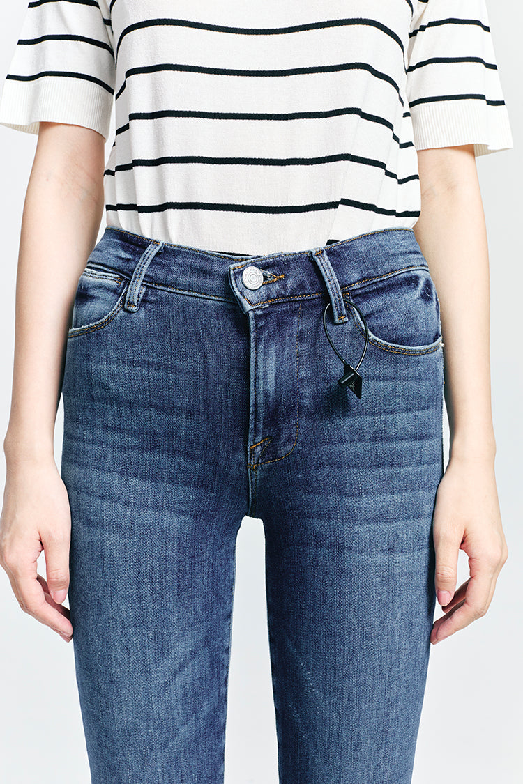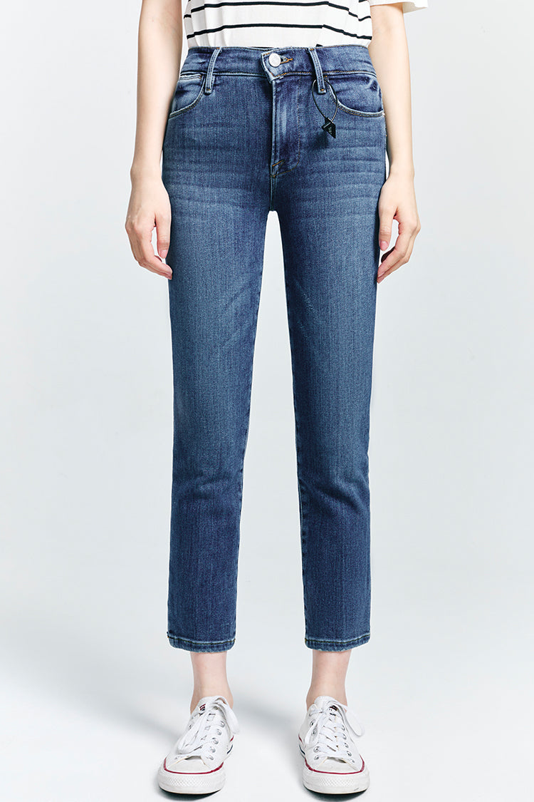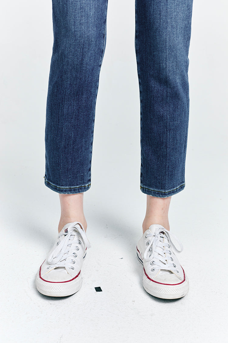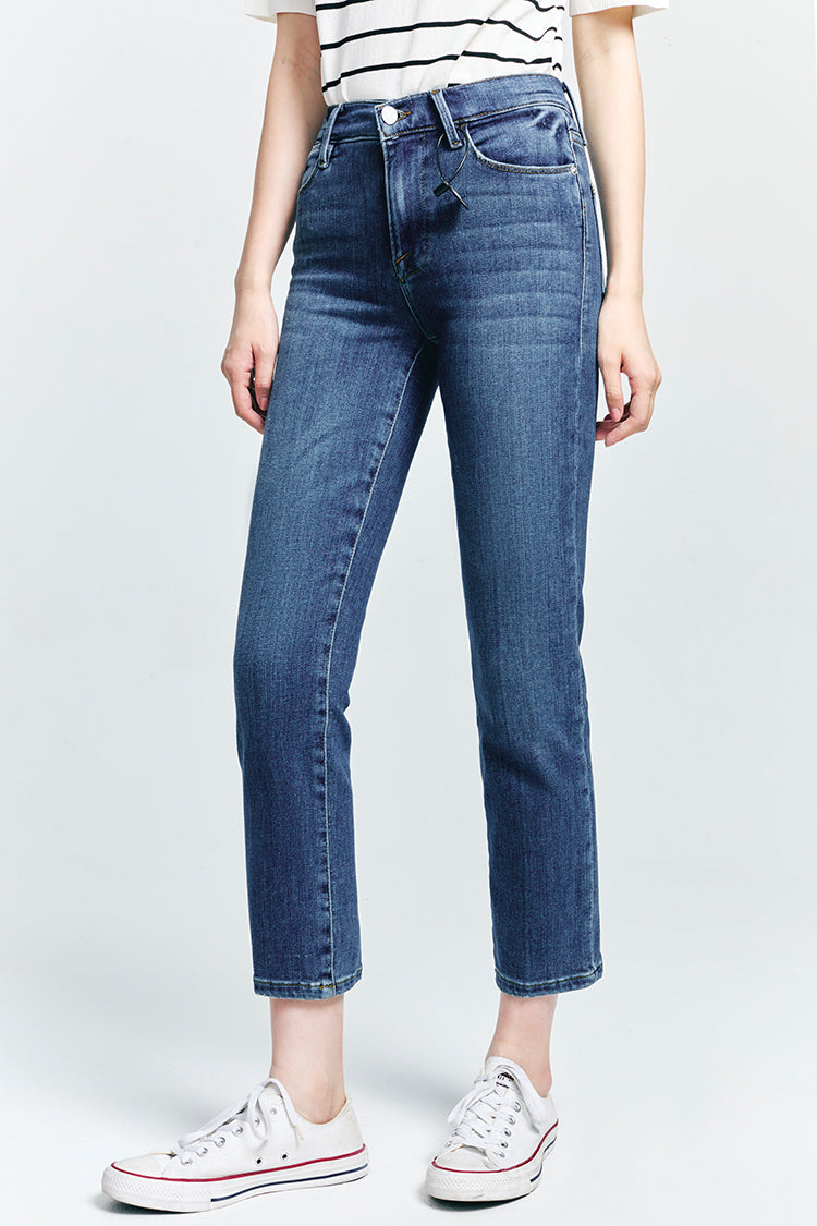 A tailored straight-leg jean, this high-rise pair is designed to be subtly fitted with a nip-in at the knees and a cropped inseam. Cut from premium stretch denim, this medium-blue wash is versatile for smart and laid-back looks alike.