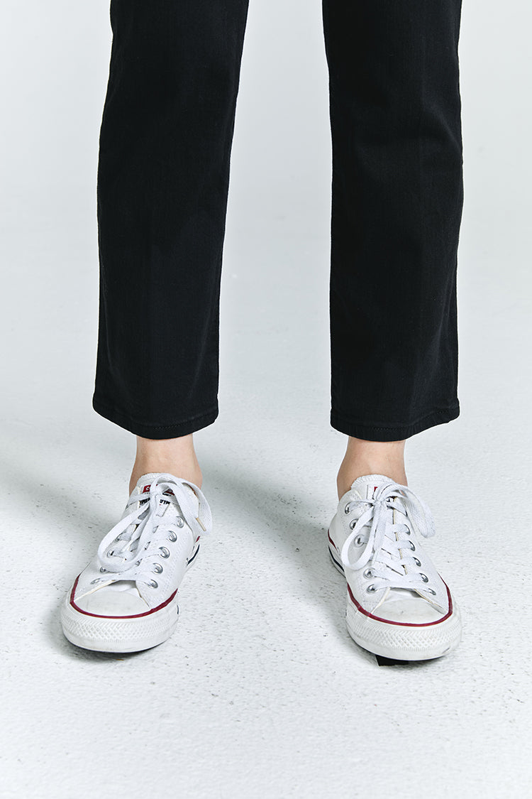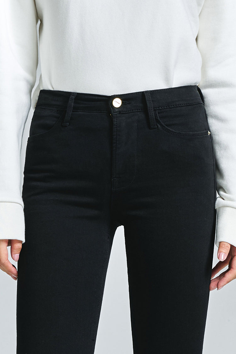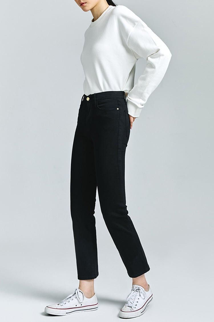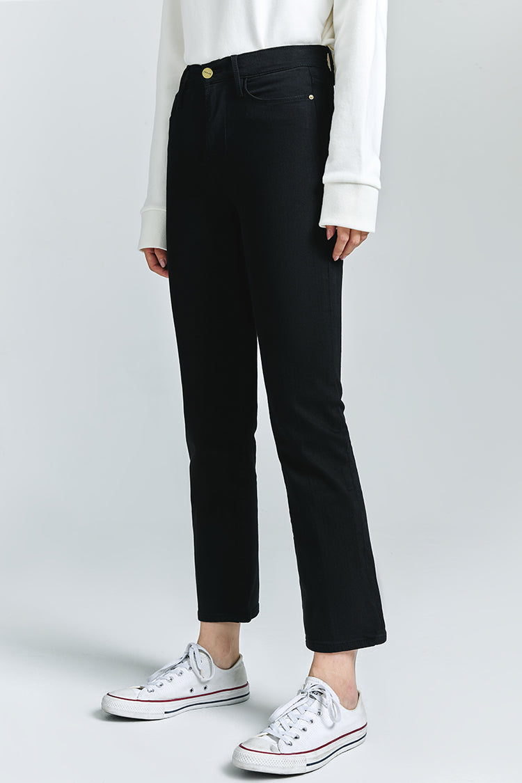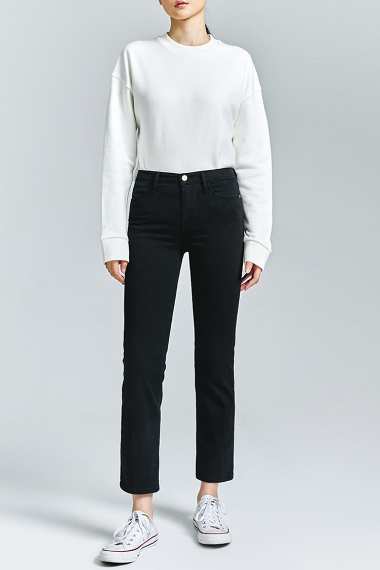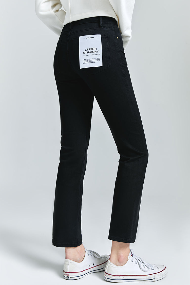 A slim fit straight leg silhouette with a high-rise waist, subtle nip at the knee and a cropped inseam. Crafted from premium black denim with super stretch and strong recovery.