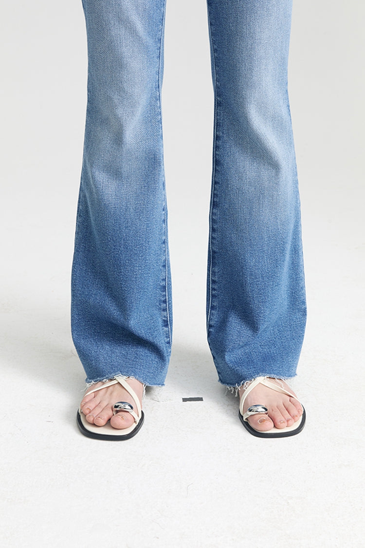 This cult-favorite flare jean has a high rise with a 29-inch length inseam and a frayed hem. Crafted from soft stretch denim, Read Between The Lines is a medium blue wash with subtle fading and whiskering.