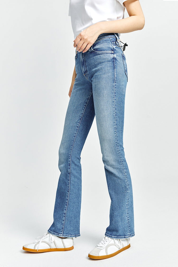 These bootcut jeans have a mid rise and a long 30-inch inseam with a clean hem. Made from a blend of recycled denim with a touch of stretch, Flag Me Down is a light-blue wash with whiskering and fading at the knees.