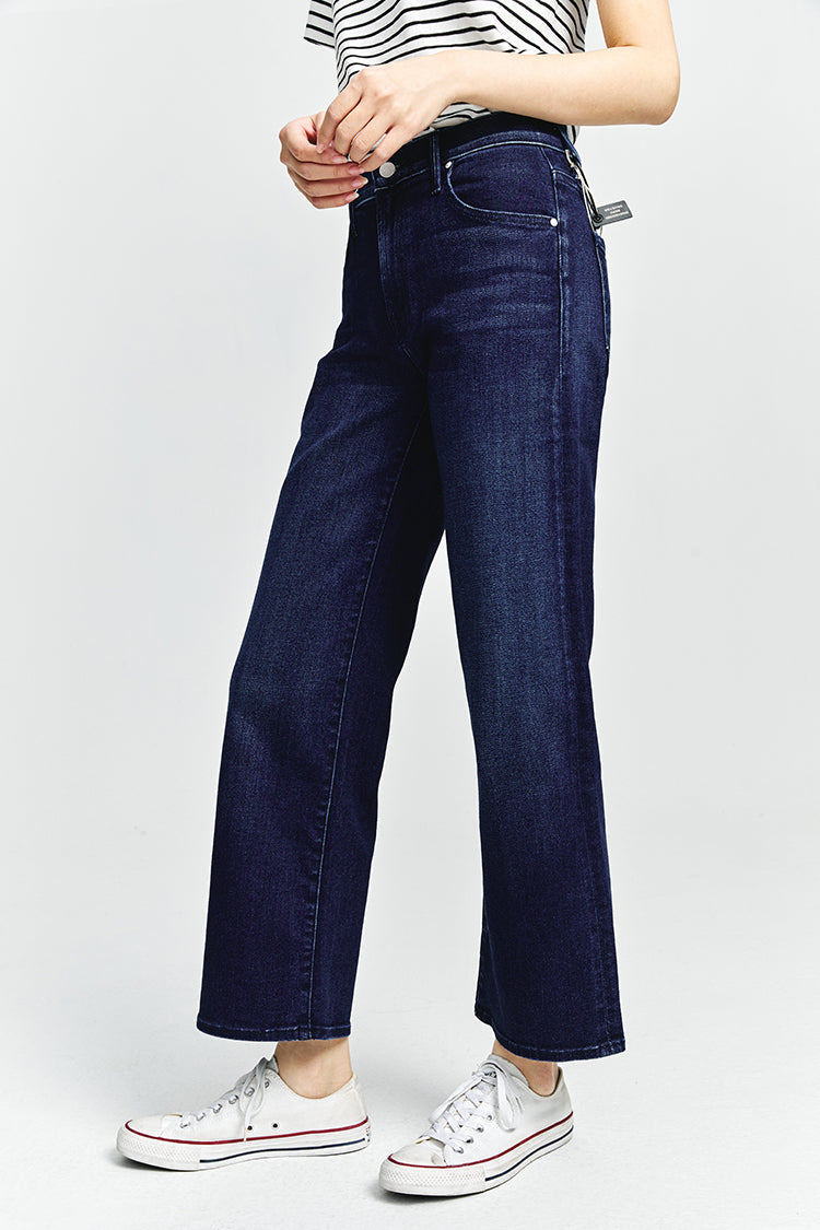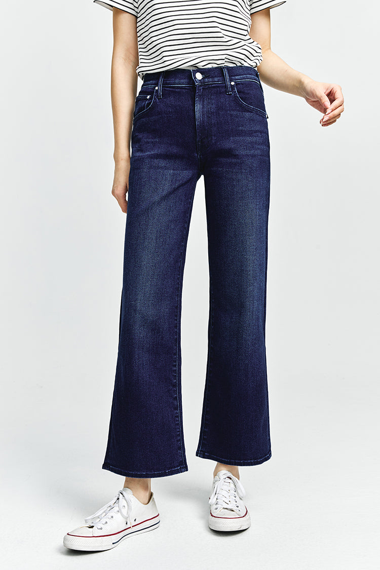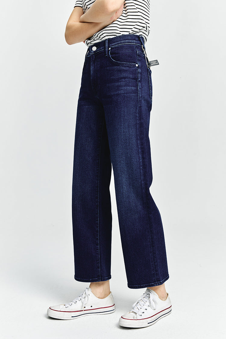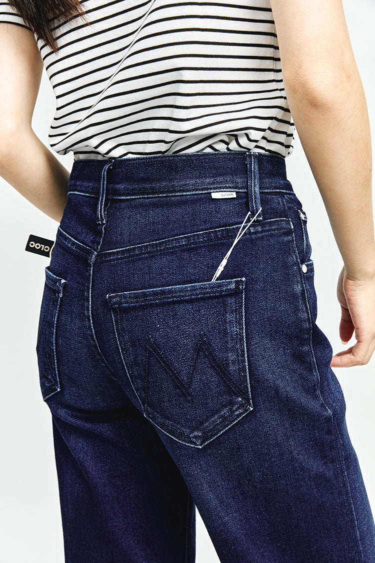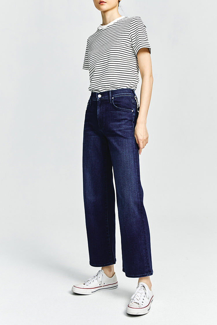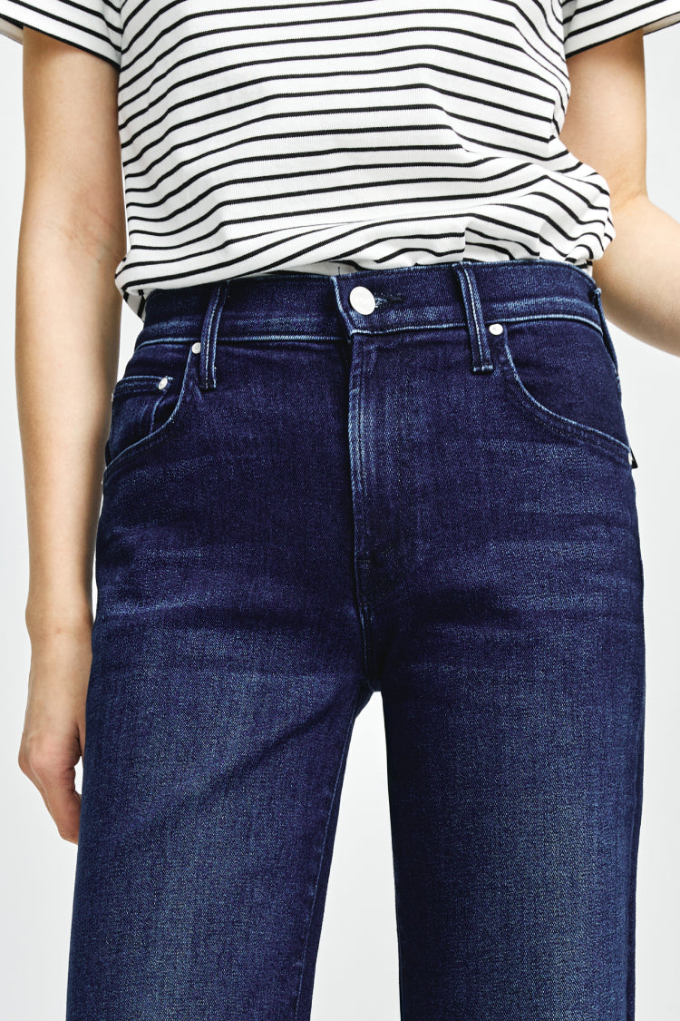 In rare form. Mid-rise jeans with a loose fit, wide leg and ankle-length inseam with a clean hem. Cut from stretch denim, Taking Shape is a dark blue wash with super subtle whiskering and fading.