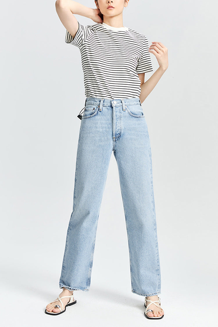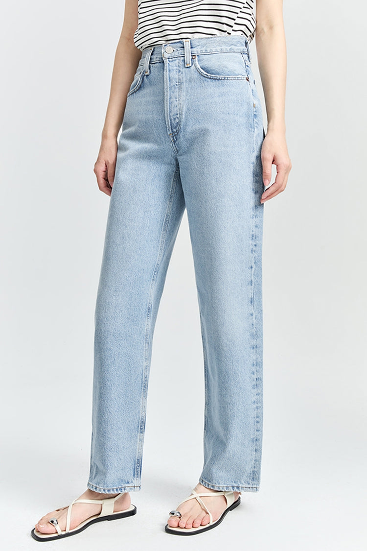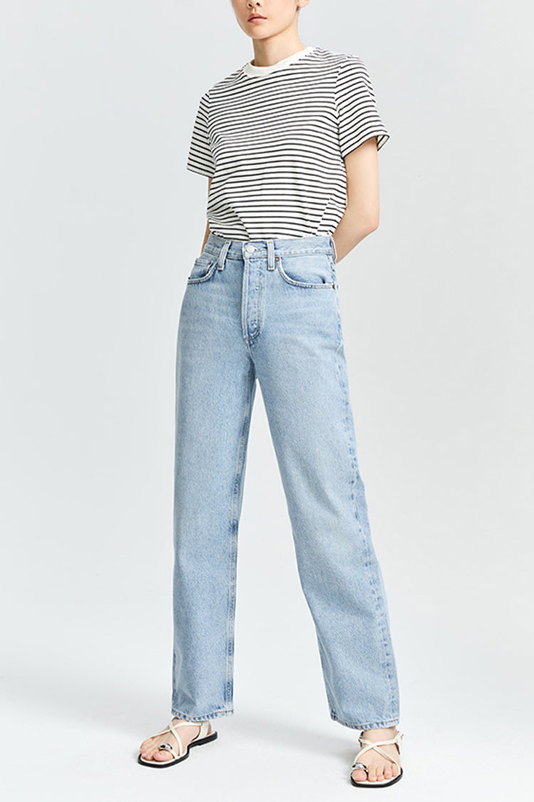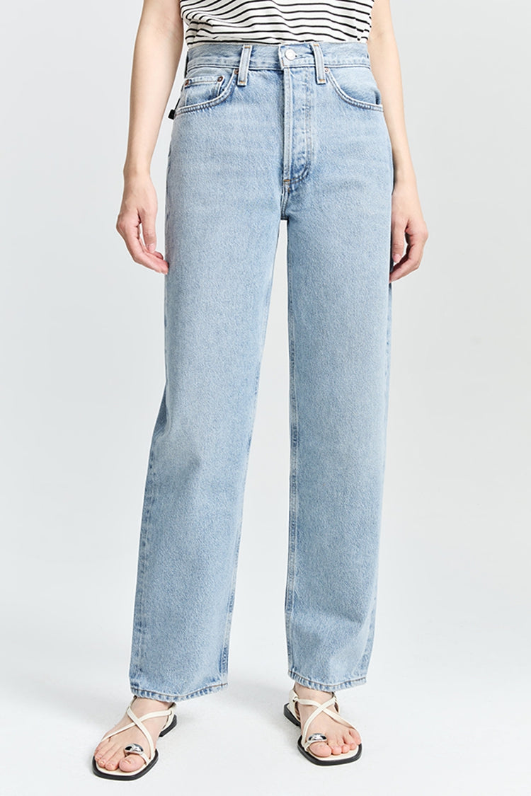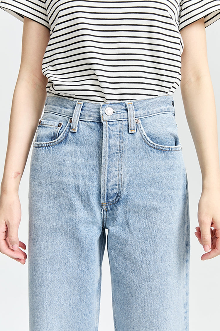 The Henson offers a relaxed fit with baggy proportions, featuring a mid-rise waist and a subtle, soft taper for a comfortable yet stylish silhouette. Crafted from non-stretch regenerative cotton in washed-out light indigo denim, it showcases subtle fading, whiskering, and marbling for a perfectly worn-in, vintage-inspired look. A versatile piece that pairs effortlessly with everything from casual tees to elevated tops, the Henson is an essential wardrobe staple with a timeless, lived-in appeal.